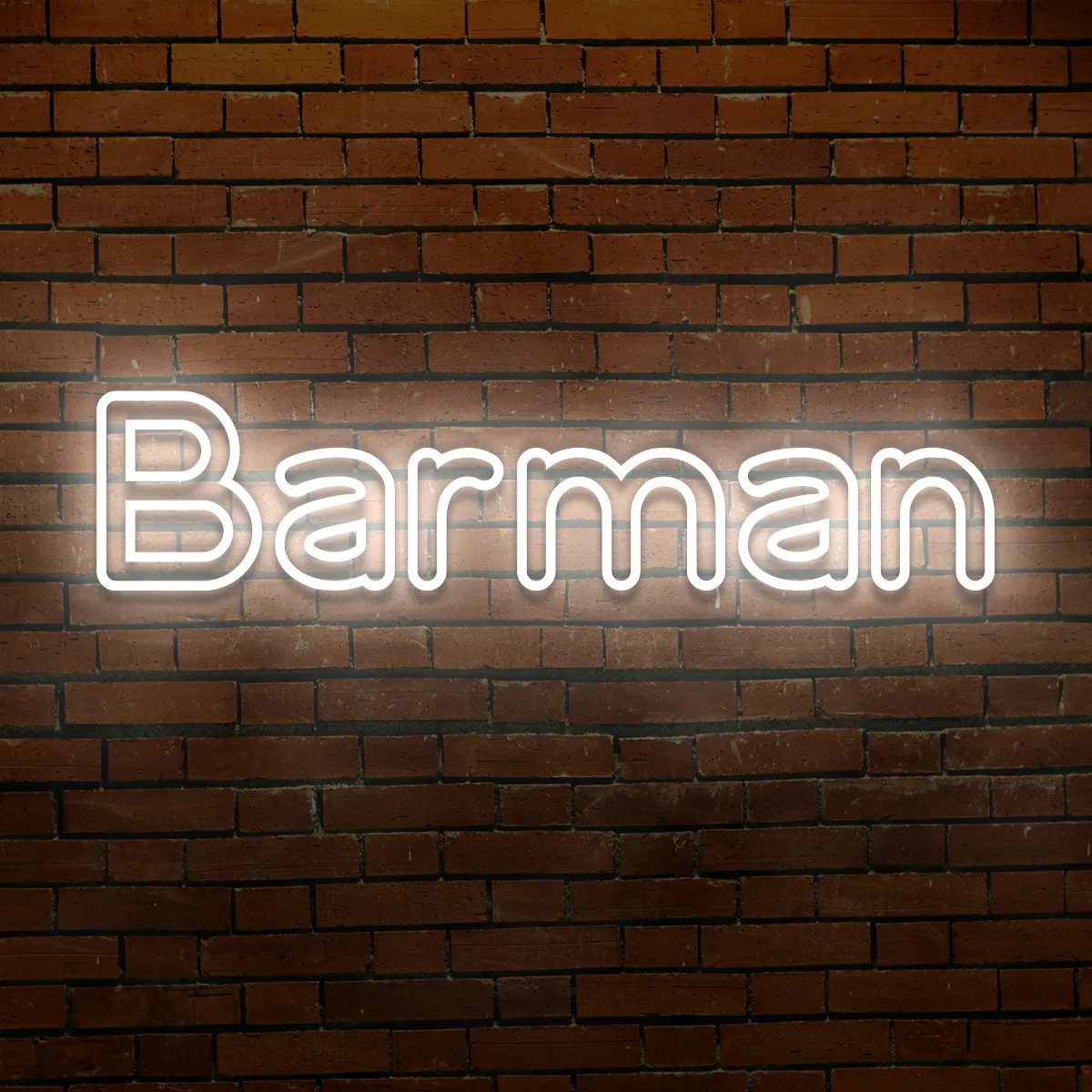 Neonowy napis „Barman” nie tylko wskaże miejsce pracy tego ważnego pracownika, ale także ozdobi ścianę za ladą barową. Dekoracja prezentuje się bardzo stylowo – wybraliśmy krój liter, który pasuje do najpopularniejszych stylów wnętrz. Ten neon świetnie uzupełni przestrzeń w stylu loft, modern, lounge i wielu innych.