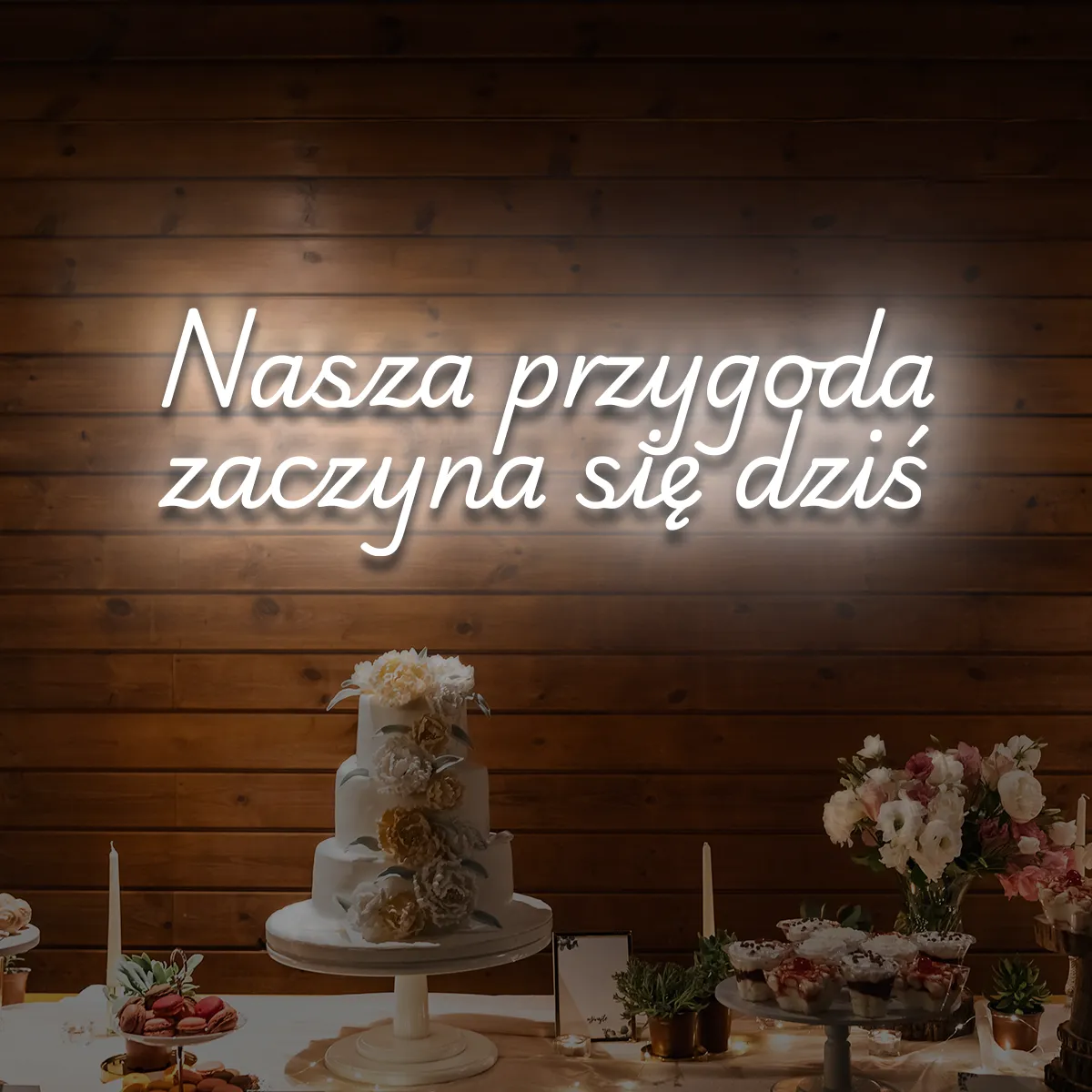 Nasza firma PrintMercial oferuje gotowy neonowy napis „Nasza przygoda zaczyna się dziś”, który stworzy niezapomnianą atmosferę i uczyni to wydarzenie wyjątkowym zarówno dla młodej pary, jak i dla gości.