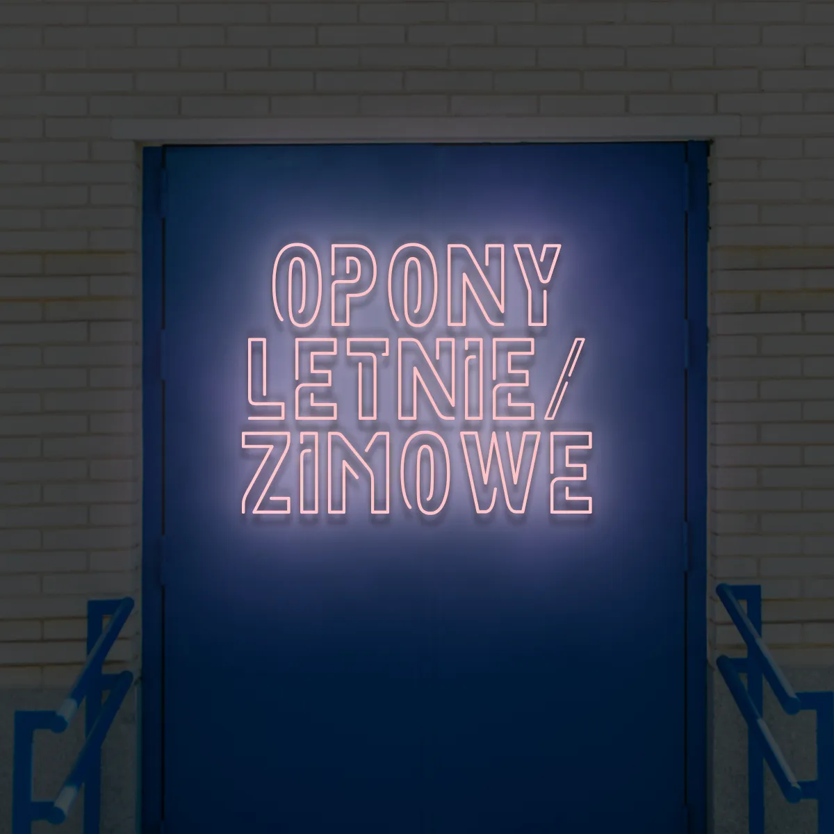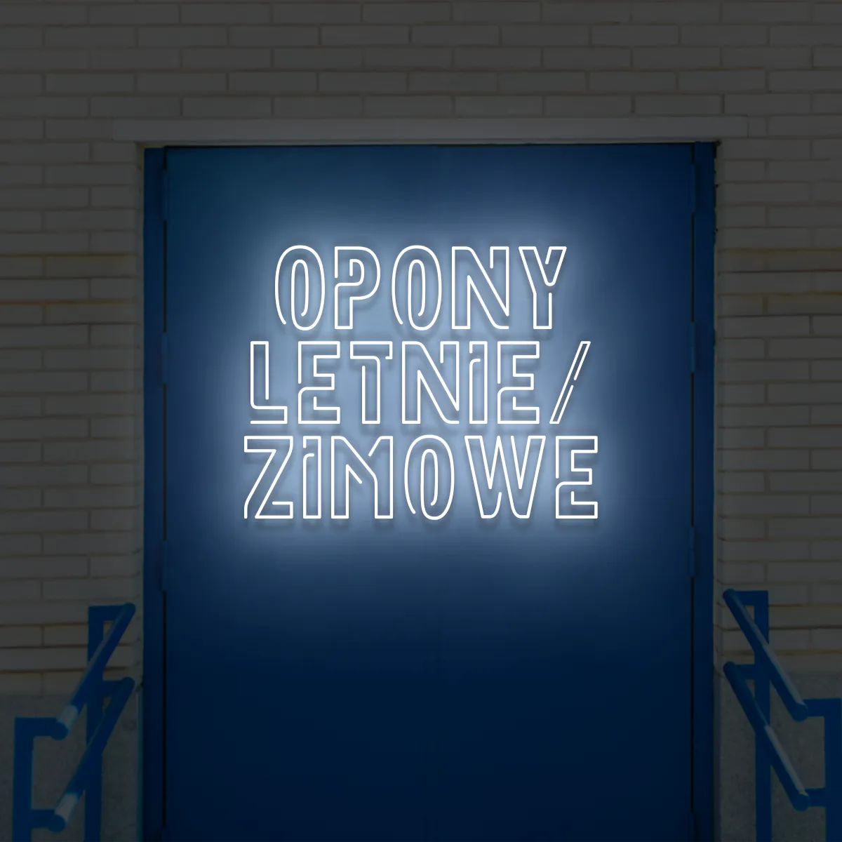 Neonowy napis „Opony letnie/zimowe” dostępny jest w dziewięciu kolorach i kilku rozmiarach. Montaż jest prosty i szybki – bez konieczności specjalistycznych narzędzi.
