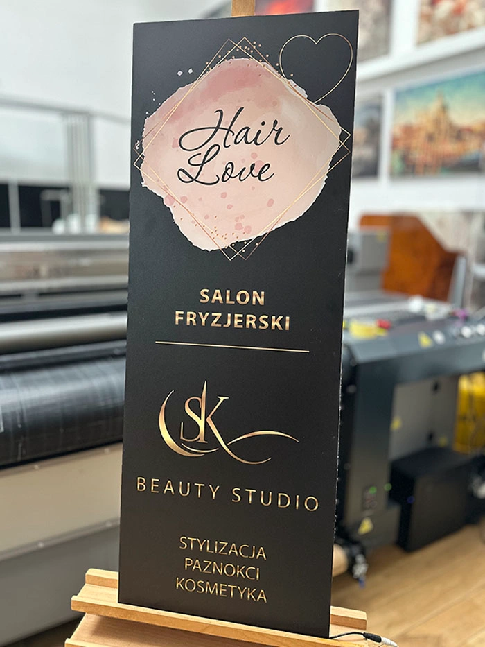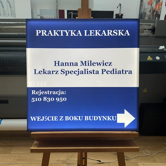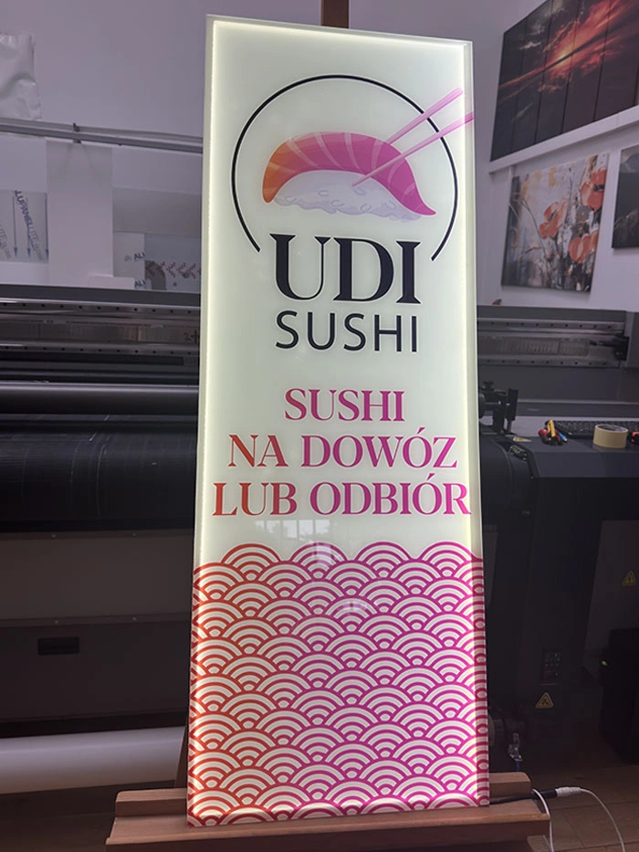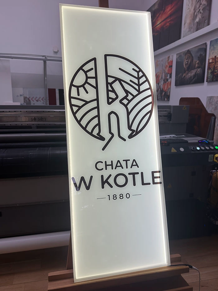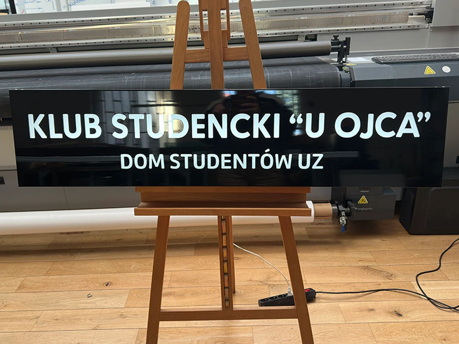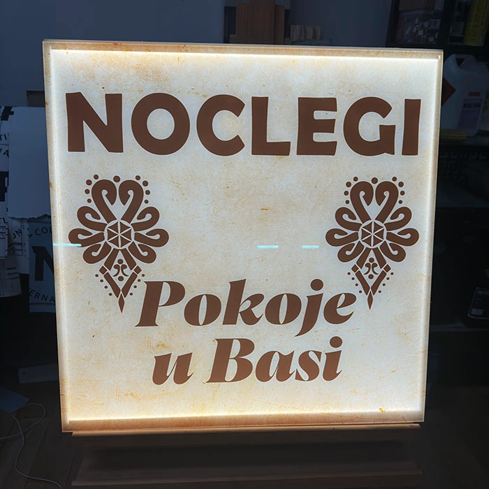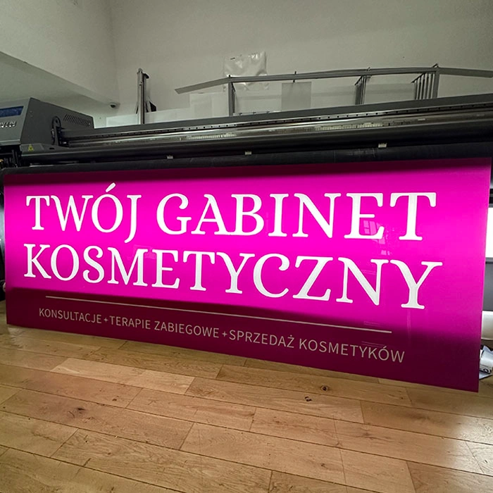 Korpus szyldu wykonany jest z pleksi, na której bezpośrednio drukujemy dowolną grafikę w technologii UV – nadruk jest odporny na promieniowanie UV, nie blaknie i zachowuje intensywne kolory przez wiele lat.