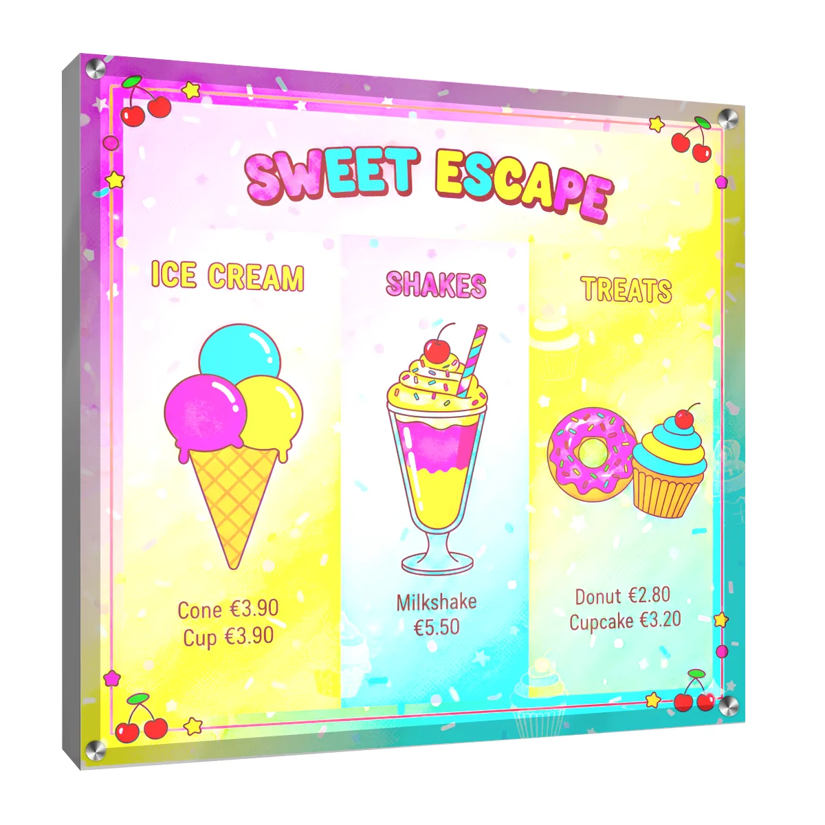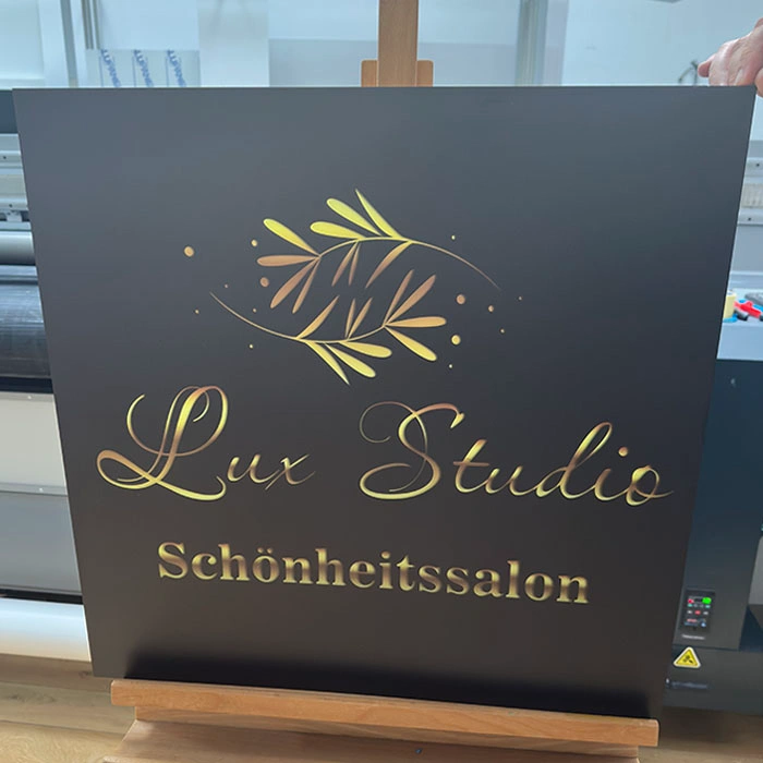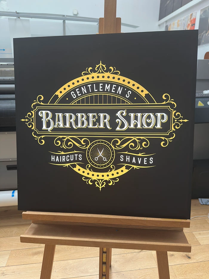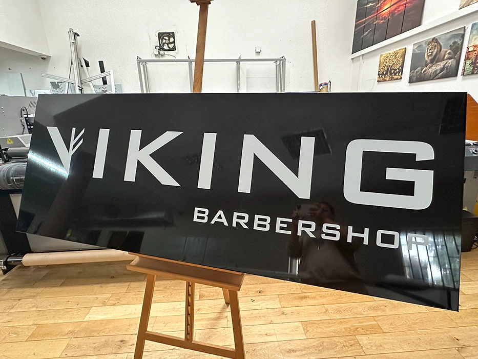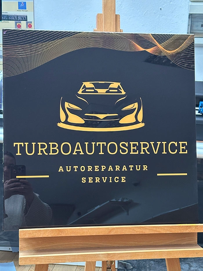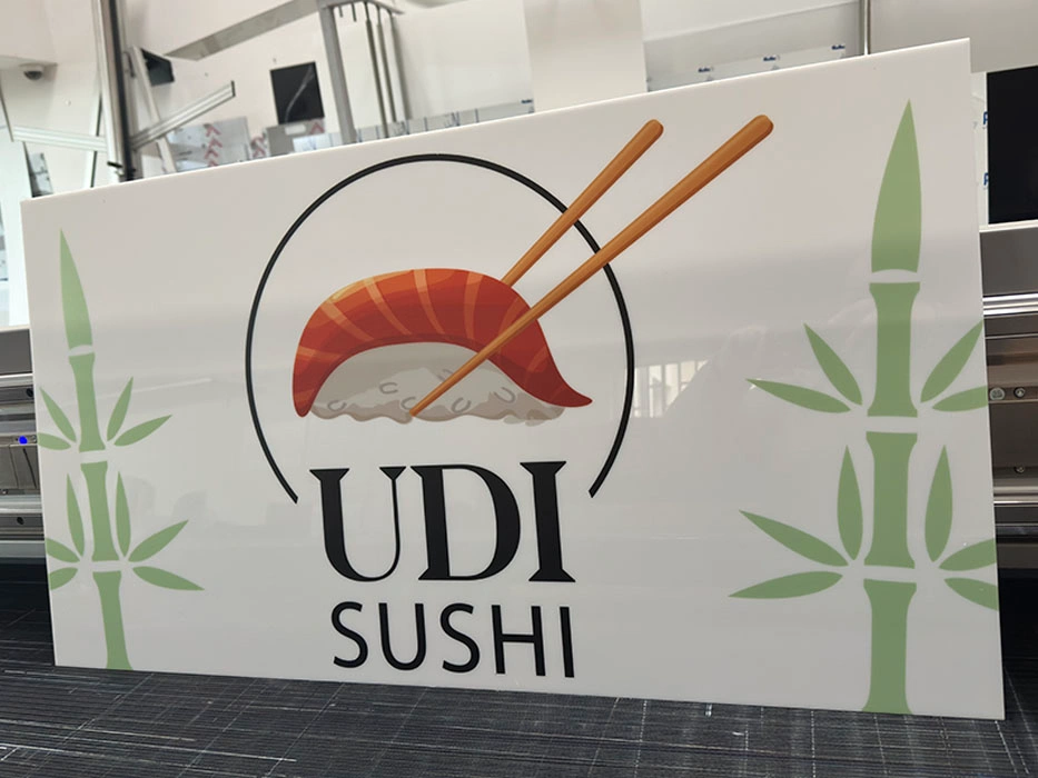 Korpus szyldu wykonany jest z pleksi, na której bezpośrednio drukujemy dowolną grafikę w technologii UV – nadruk jest odporny na promieniowanie UV, nie blaknie i zachowuje intensywne kolory przez wiele lat.
