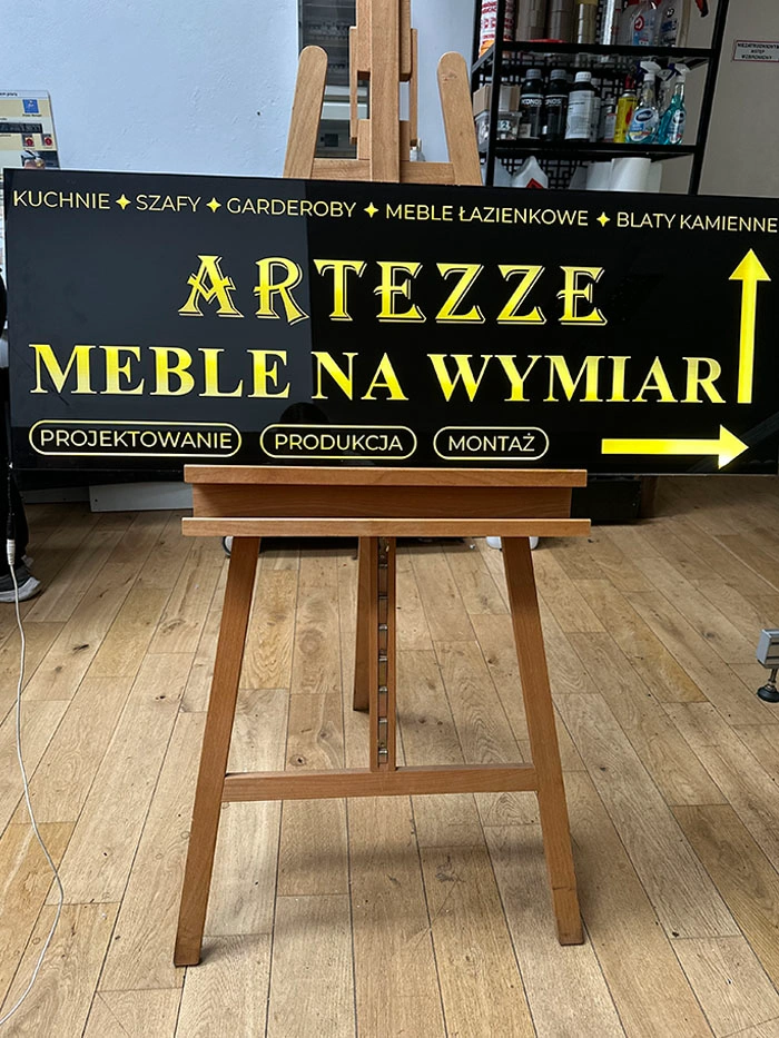Wewnętrzna część konstrukcji powstaje ze spienionego PCV, dzięki czemu cały szyld pozostaje lekki, trwały i łatwy w montażu.