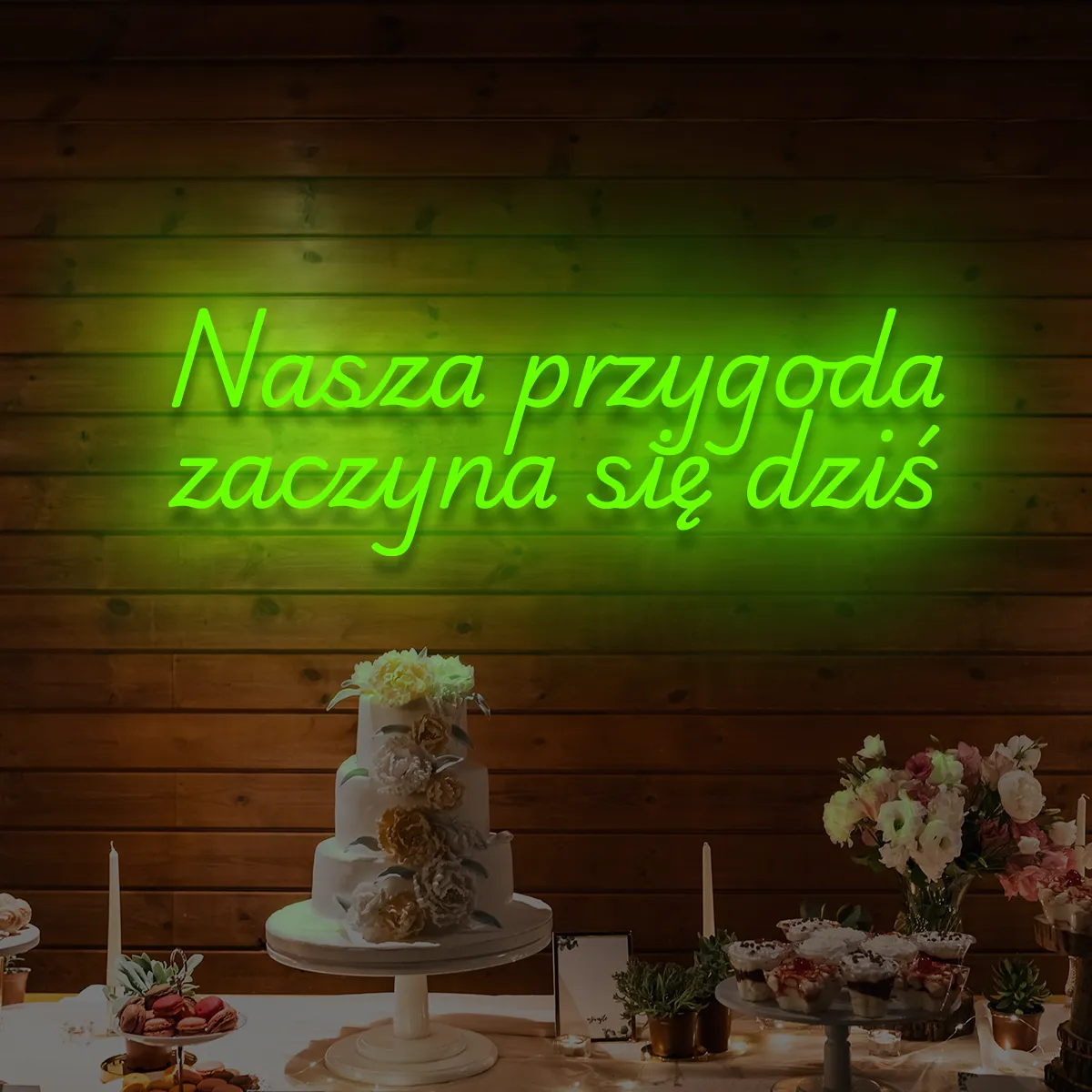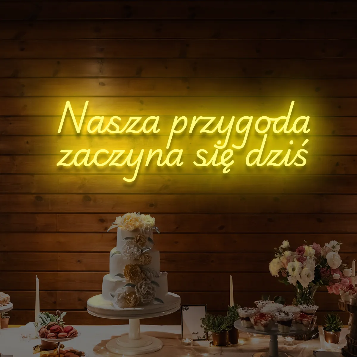 Nasza firma PrintMercial oferuje gotowy neonowy napis „Nasza przygoda zaczyna się dziś”, który stworzy niezapomnianą atmosferę i uczyni to wydarzenie wyjątkowym zarówno dla młodej pary, jak i dla gości.