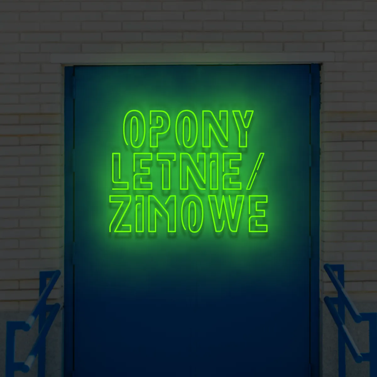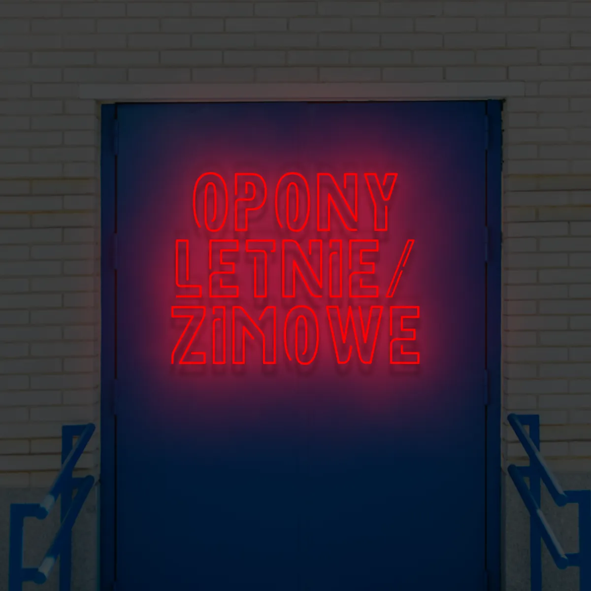 Neonowy napis „Opony letnie/zimowe” dostępny jest w dziewięciu kolorach i kilku rozmiarach. Montaż jest prosty i szybki – bez konieczności specjalistycznych narzędzi.