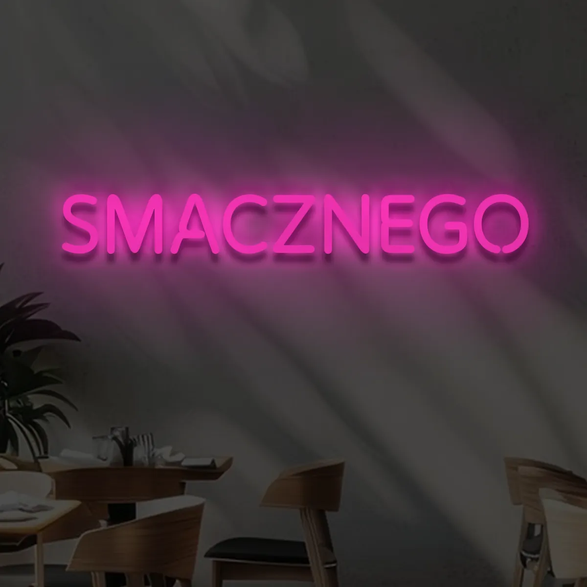 Stylowa i wyrazista reklama z LED napisem Smacznego została stworzona specjalnie dla Twojego lokalu. Jesteśmy tego całkowicie pewni, dlatego zachęcamy naszych klientów, by nie zwlekali i jak najszybciej ozdobili wnętrze swoją własną reklamą neonową. Przyjemne, ciepłe światło neonu stanie się tym elementem, który przyciągnie gości, zachęcając ich do zjedzenia czegoś pysznego lub wypicia aromatycznej kawy.